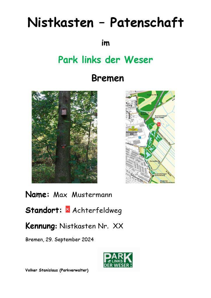 Wie wäre es mit einer Nistkasten-Patenschaft im Park links der Weser, vielleicht als Geschenk zum Geburtstag oder zu Weihnachten?