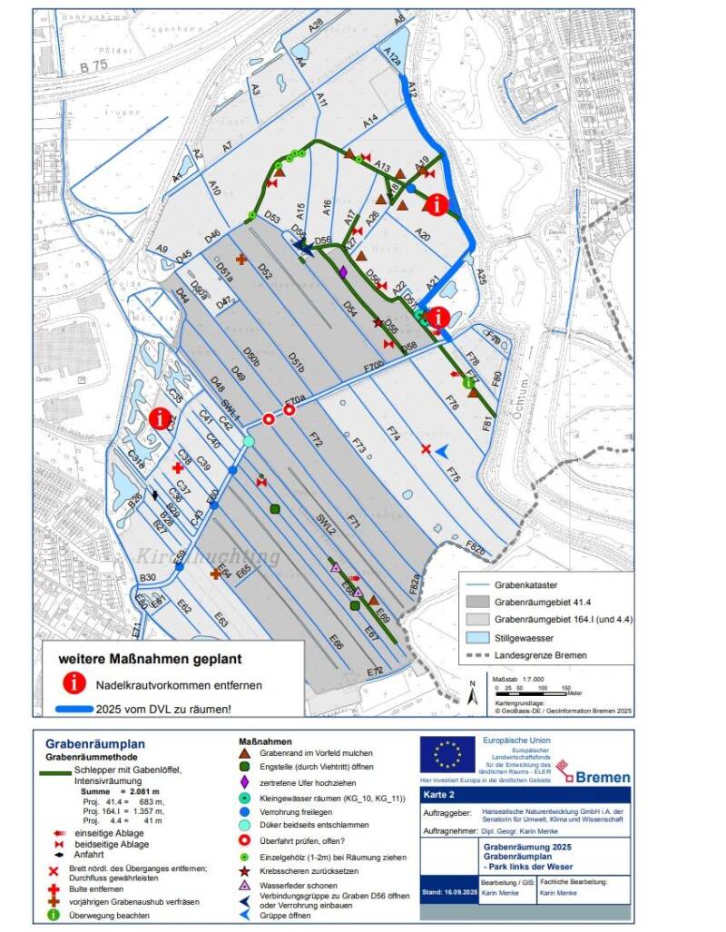 Vor diesem Hintergrund beobachtet die Naturschutzbehörde die zunehmende Ausbreitung der Art mit großer Sorge. Um einer weiteren Ausbreitung entgegenzuwirken, wurden im Jahr 2025 im Park links der Weser umfangreiche Eindämmungsmaßnahmen umgesetzt. Über einen Zeitraum von mehreren Monaten hinweg fanden dort intensive und kostenintensive Arbeiten statt, mit dem Ziel, das Vorkommen des Nadelkrauts wirksam zu reduzieren und weitere ökologische Schäden zu verhindern.
