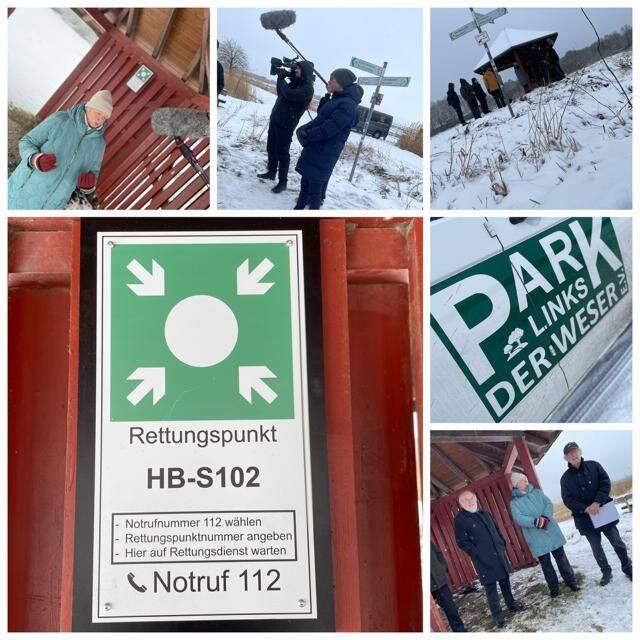 Im Park links der Weser wurden neue Rettungspunkt-Schilder offiziell übergeben. Treffpunkt war der Unterstand an der frisch gefluteten Eislauffläche.