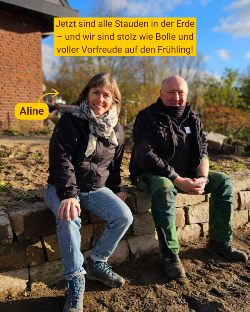 Dann ging es los – bei bestem Wetter und mit einem un-glaublich motivierten Team. Über 500 heimische Stauden fanden Platz in der Erde und wir waren sogar schneller fertig als gedacht! Neben den Mauerbeeten entstand eine Wildbienen-Düne – ein großes Sandarium für bodennistende Arten, das künftig ein wertvoller Rückzugsort wird.